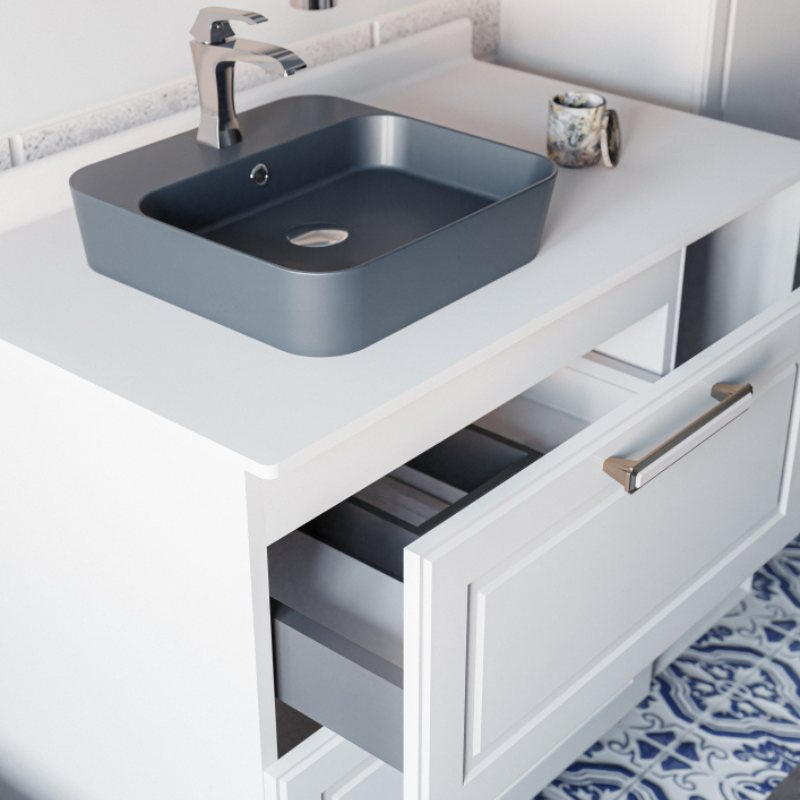 Med to romslige skuffer og en åpen hylle får du god plass til håndklær, toalettsaker og andre nødvendigheter. Den glatte, hvite overflaten gjør rengjøringen enkel, samtidig som skapet gir et lyst og elegant uttrykk.